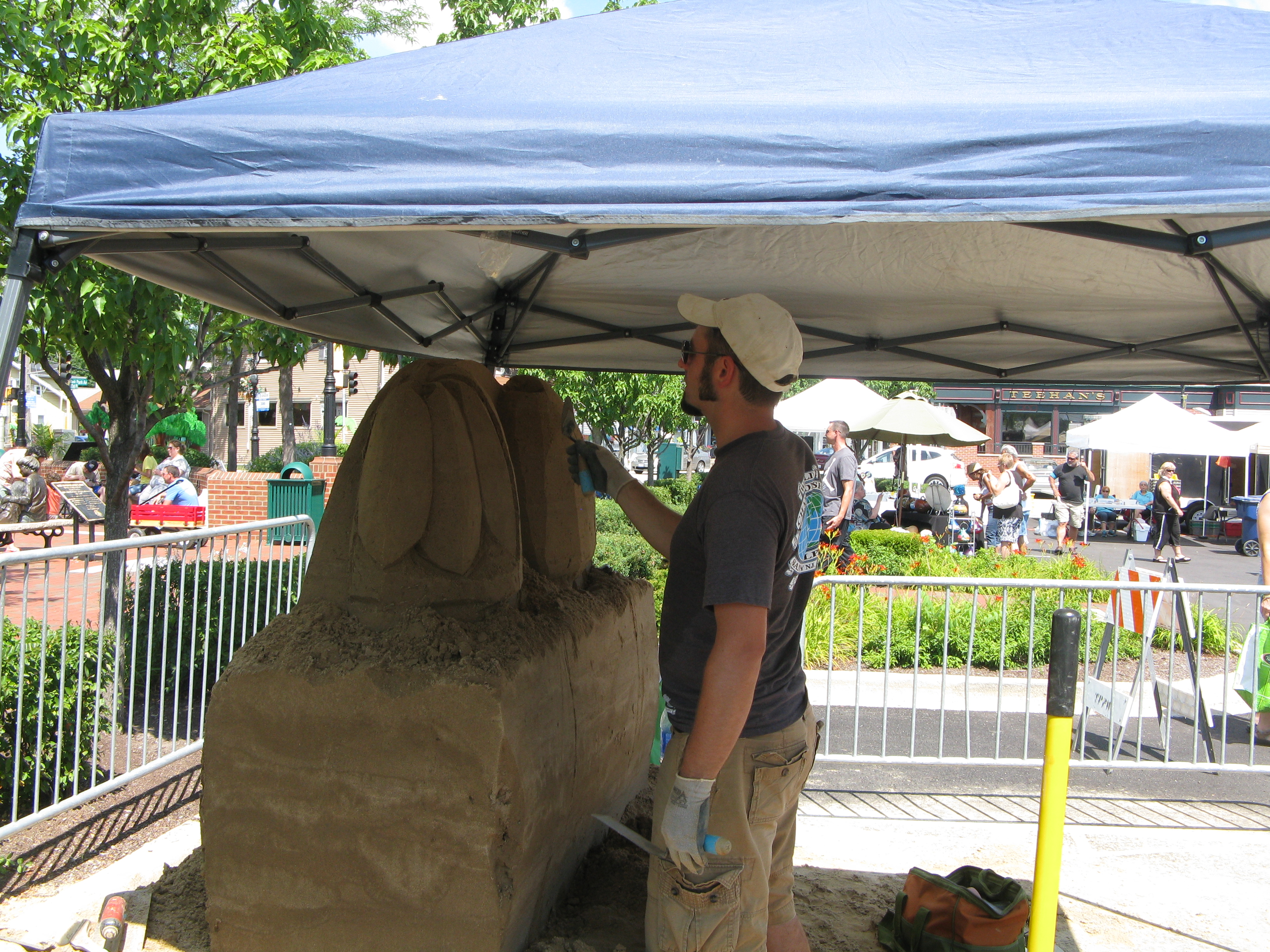 Despite the decided lack of farmers, the TPFM did have several booths selling food items. The best sign goes to the cheese booth: Caseum Diem (Cheese the Day). I would have bought cheese there just because the sign was clever, but it would have spoiled in the hot car before we returned home. I resisted flavored olive oil, dubious foodstuff on a stick, and assorted jams and jellies. I did end up buying a caramel apple coffee cake ($10). The booth was serving samples, which were delicious. Veni. Gustaverim. Emi. (I came. I tasted. I bought!) Other booths were filled with things we could live without (e.g., fleece blankets, which were probably not the best thing to sell in 90 degree heat, or necklaces of teen pop stars made out of bottle caps) and some beautifully made items that were more than I wanted to spend that day (e.g., painted gourd planters or a lovely oak pie cupboard with punched tin panels). But it was fun to look, and we spent an hour poking around. There was even some entertainment in the form of a violinist (who seemed to be raking in the money) and half of the winning team from the most recent Virginia Beach Sand Castle Championships. He was making palm trees from a sand block for a Caribbean-themed street party that was to be held the next day.