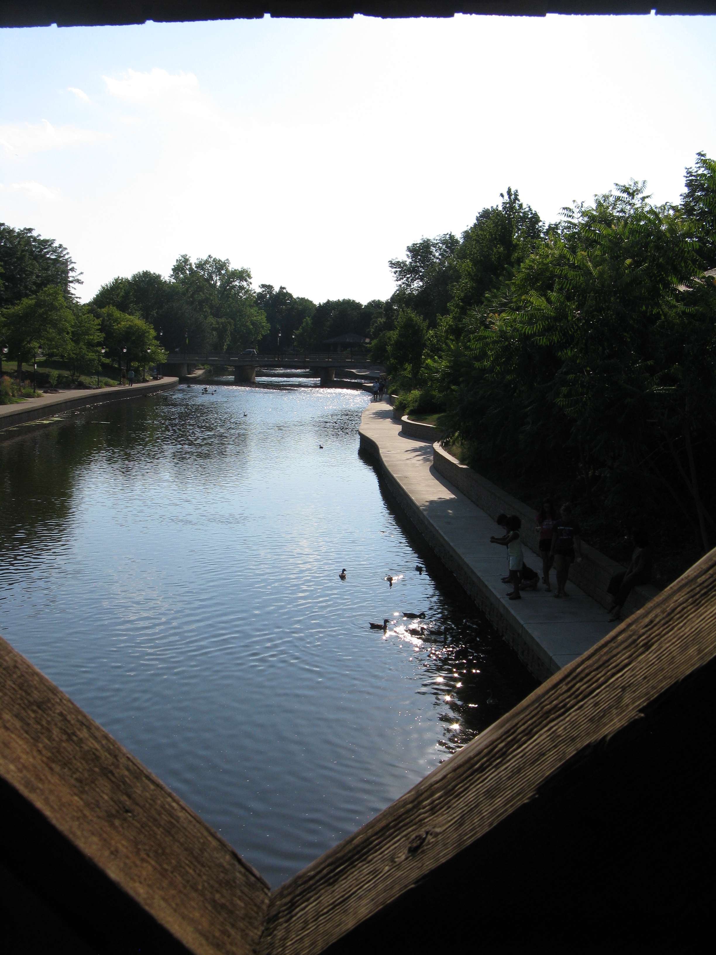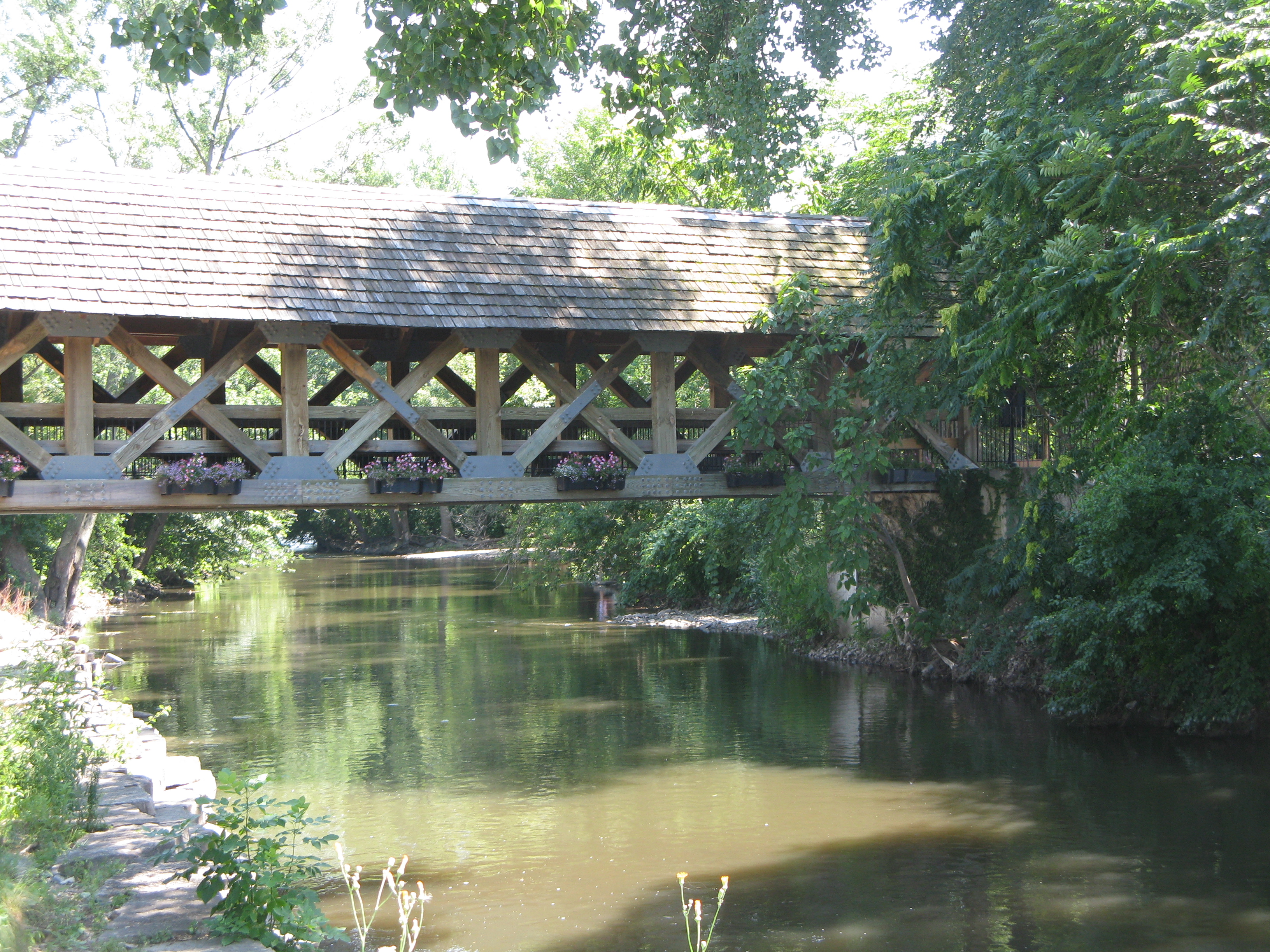 Then we walked a different part of the river walk, heading the opposite way. This part had a concrete path along the river and a wider brick path up at street level. There was less shade here, but it was still fun to people watch, admire assorted art and fountains (including the aptly named Dandelion Fountain) and crisscross the river on the various bridges (covered bridges for pedestrians only or regular street bridges. Naperville’s vibrant downtown had more shops and restaurants than we could explore, the river walk was an unexpected delight, and there is even a historic area that we didn’t investigate because it was closed for an Ale Fest the day we were there.