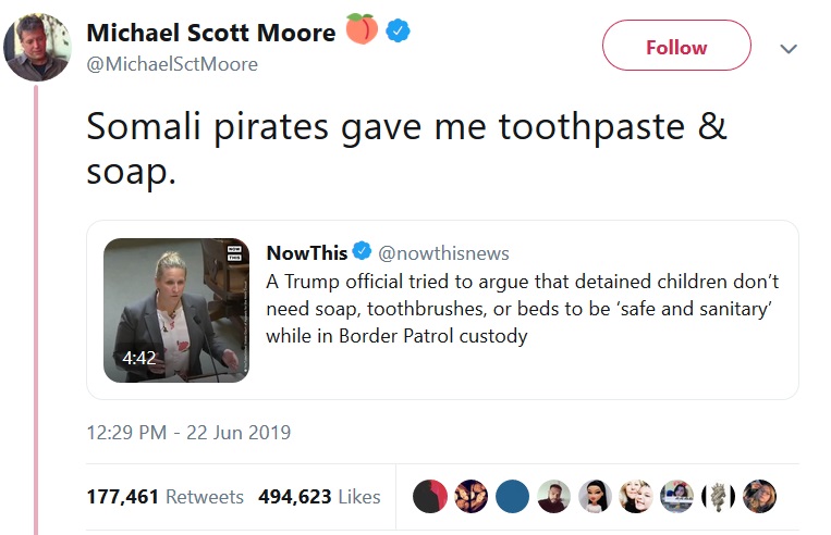 One Trump administration lawyer tried to argue that they were only charged with maintaining “safe and sanitary” conditions, and soap and toothpaste were unnecessary to meeting that requirement. This prompted clapback on Twitter from Michael Scott Moore, who in 2012 was kidnapped and held for two and half years by Somali pirates. On June 22, he tweeted, “Somali pirates gave me toothpaste & soap.” David Rohde, a journalist kidnapped by the Taliban in 2008, retweeted Moore on June 24, and added, “The Taliban gave me toothpaste & soap.” What does it say about us when the US government has lost the moral high ground to pirates and the Taliban?